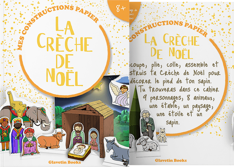 Tu trouveras dans ce livre 9 personnages (Jésus, Marie, Joseph, le berger, les rois mages et 2 anges), 8 animaux (un âne, un bœuf, 2 agneaux, un chien, un cheval, un chameau et un éléphant), une étable, un paysage, une étoile et un sapin.