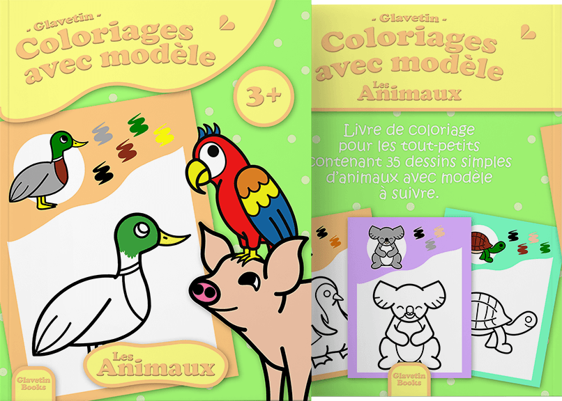 Contient 35 dessins simples d’animaux aux contours épais avec modèle à suivre. Une à cinq couleurs par dessins.