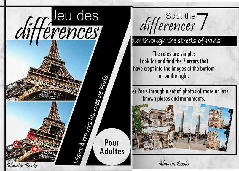Jeu des 7 différences pour adultes sur le thème des lieux et monuments plus ou moins connus de la ville de Paris. Découvrez la ville de Paris en vous laissant guider à travers ses rues à la recherche des monuments connus mais aussi des lieux d’intérêts moins connus mais tout aussi fascinant.