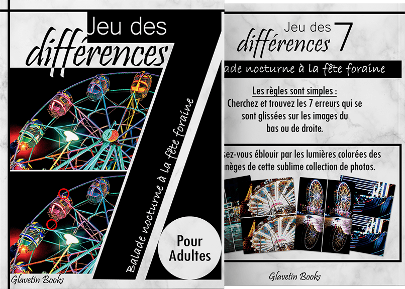 Jeu des 7 différences pour adultes sur le thème des manèges pour le plus grand plaisir des amateurs de l’ambiance festive des fêtes foraines. Laissez-vous éblouir par les lumières colorées des manèges de cette sublime collection de photos tout en gardant votre cerveau à l’affût et ainsi entretenir votre sens de l’observation.